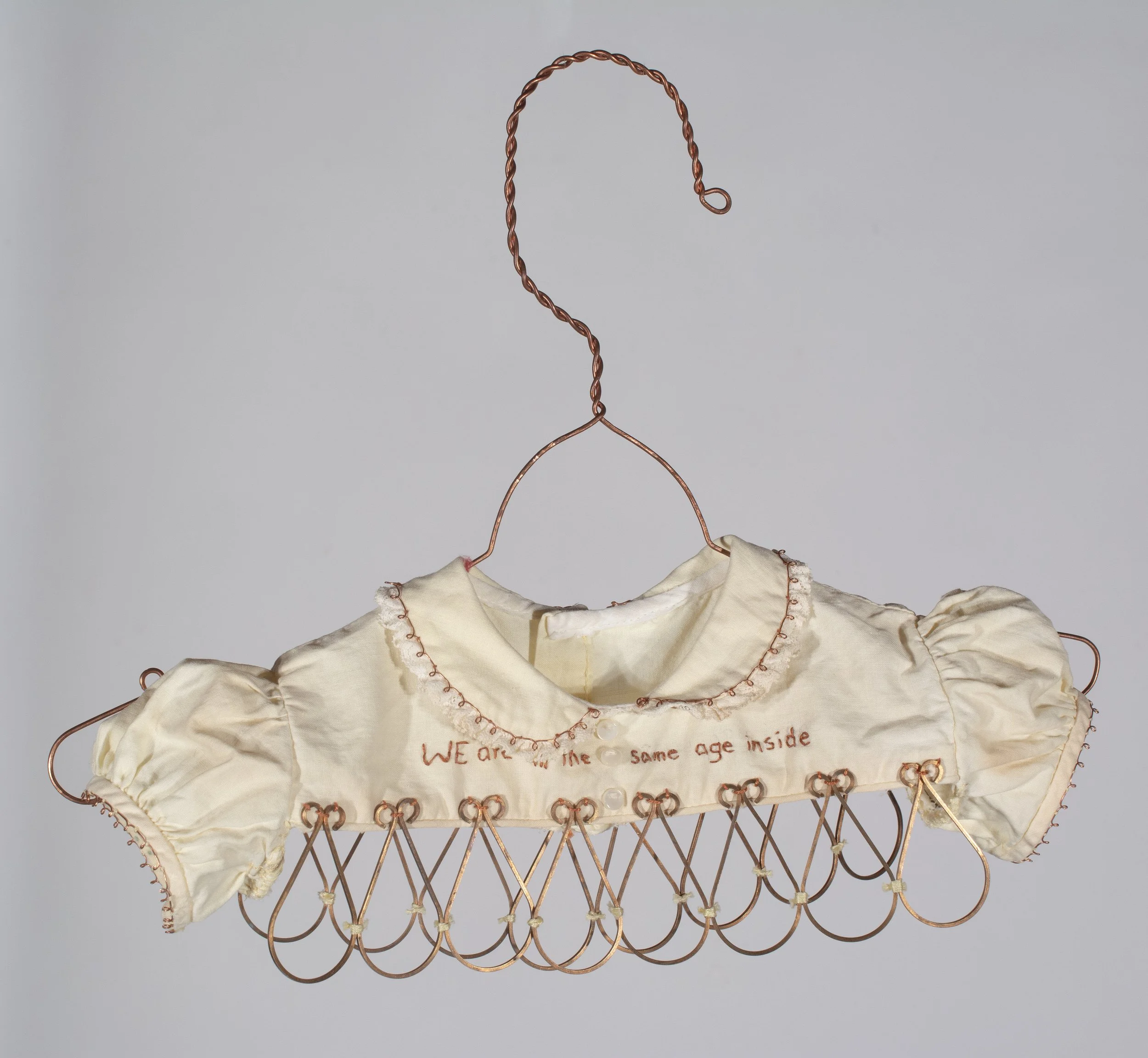 Letterpress printed hand-dyed muslin, felt corset, paper panniers, vintage machine stand, wood base